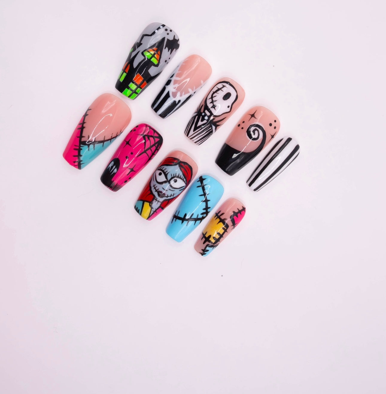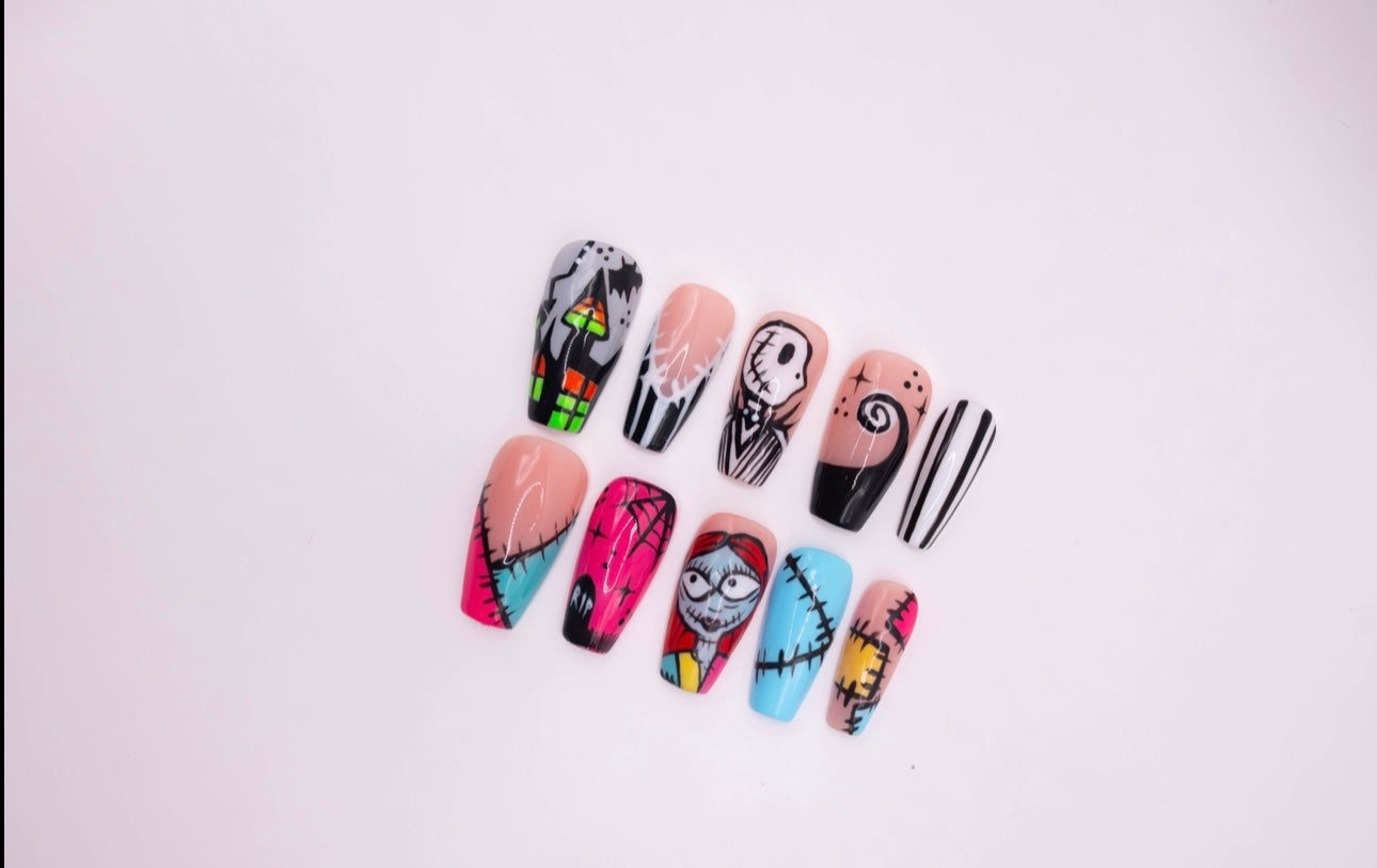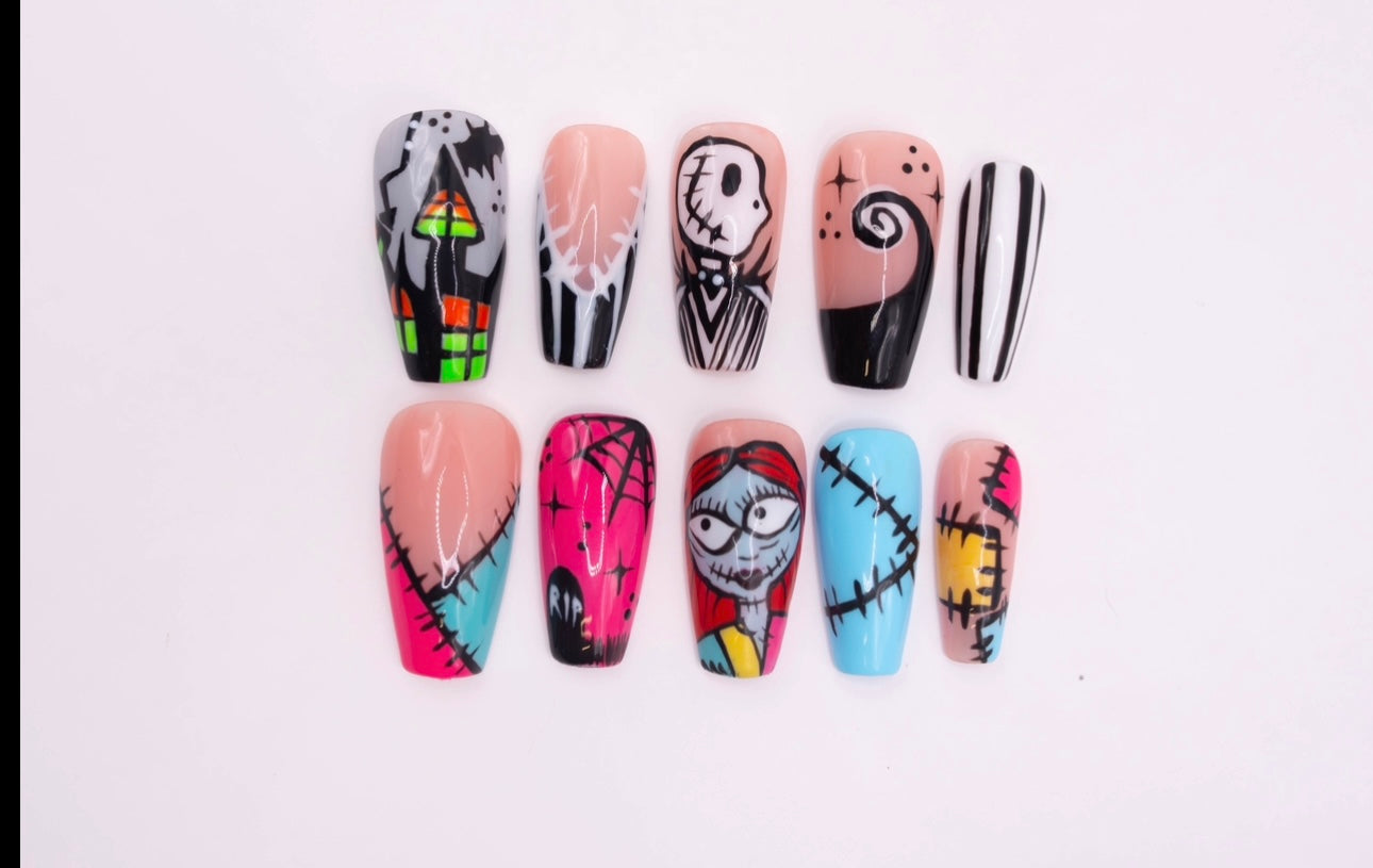 Sally inspired press-on nails. Featuring designs straight from The Nightmare Before Christmas, this set blends gothic charm with a touch of sweet love. Perfect for Halloween or any fan of Tim Burton’s classic tale.
